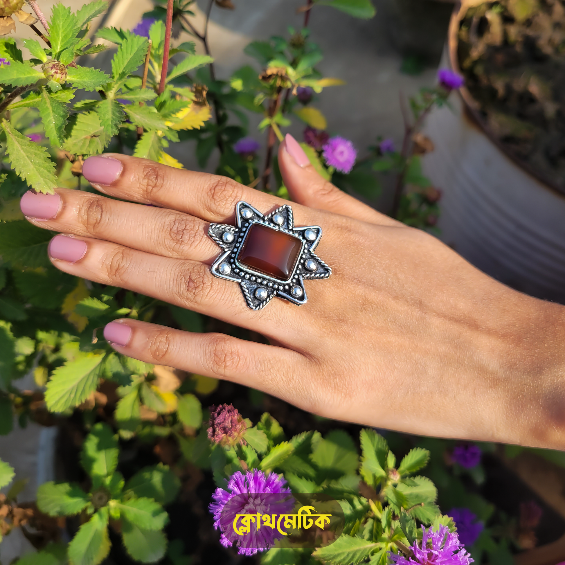 Shine bright with this Starburst Oxidized Akik Finger Ring, featuring a rich brown Akik stone at its centre. Set within a striking star-shaped oxidized frame adorned with intricate detailing and beadwork, this ring exudes vintage charm and bold elegance.