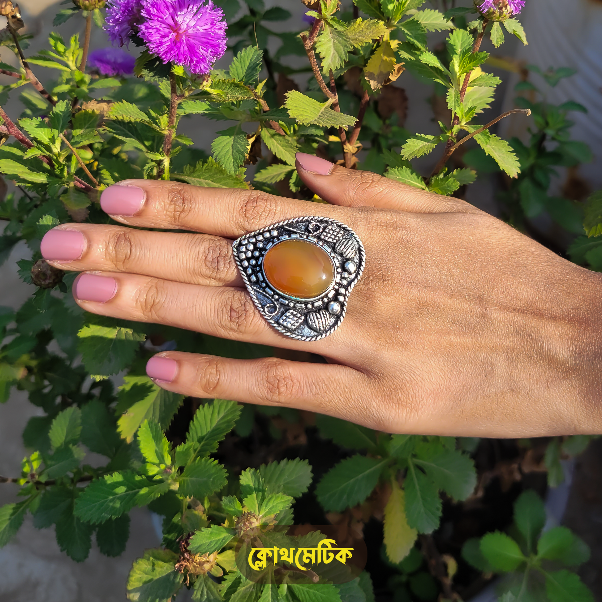 Elevate your style with this Heart-Shaped Oxidized Akik Finger Ring, featuring a warm amber-toned Akik stone set in a uniquely designed heart-shaped oxidized frame. The intricate detailing, with delicate beadwork and textured accents, adds a touch of vintage charm and sophistication.